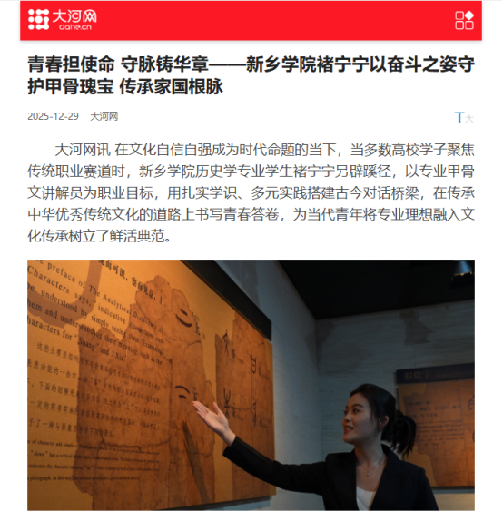 历史学专业学生褚宁宁选择独特发展路径,以甲骨文双语讲解员为方向,在校史馆累计志愿服务超过180小时 蘑菇17.cctv,并通过在中国文字博物馆的深入实践,实现了从“知识学习者”到“文化传承者”的转变,她传播中华优秀传统文化的事迹获大河网专题报道,为青年学子将专业学习融入文化传承提供了生动范例。