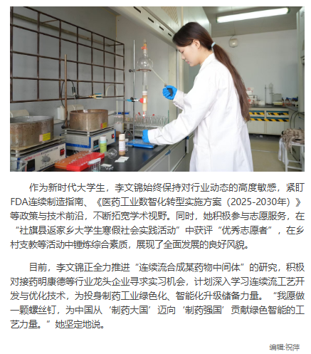 药学院制药工程专业学子李兰辛与李文锦则在医药领域书写青春答卷 蘑菇17在线,李兰辛以屠呦呦先生为精神标杆,深耕中药现代化研究,斩获全国大学生制药工程设计大赛一等奖,参与发表4篇SCI论文,牵头国家级创新创业训练项目,李文锦聚焦连续流绿色制药领域,发表多篇SCI论文,带领团队完成的创新项目获全国大学生生命科学竞赛国家级三等奖,参与的大学生创新训练计划项目获批国家级立项,以科研实践推动制药工业向绿色化,智能化迈进,二人的成长故事受到顶端新闻,大河网等媒体关注。