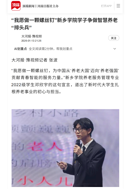 在学校的精心培育下,一批批学子在创新创业的道路上崭露头角 蘑菇视频站,收获了亮眼成绩,养老服务管理专业2022级学生邓欣宇深耕智慧养老领域,专业课成绩稳居90分以上,斩获国家奖学金等多项荣誉,他带领团队聚焦行业痛点,形成“失能老人生活管家”一体化方案,荣获省级创新创业大赛二等奖1次,三等奖3次,其创业项目获批国家级立项,相关事迹被顶端新闻等媒体报道,彰显了新时代大学生扎根养老事业的初心与担当。