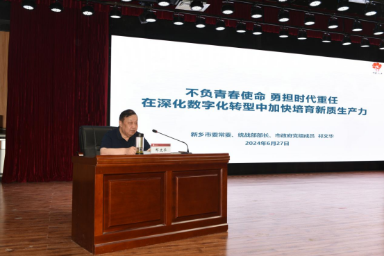 6月27日下午,在我校文化艺术中心,新乡市委常委,统战部部长,市政府党组成员祁文华为我校师生讲授题为《不负青春使命 勇担时代重任 在深化数字化转型中加快培育新质生产力》的专题思政课,新乡市有关单位同志,蘑菇17在线师生代表参加学习 蘑菇17视频,副校长张银堂主持报告会。