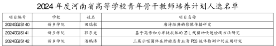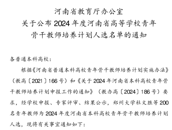 近日,河南省教育厅下发《关于公布2024年度河南省高等学校青年骨干教师培养计划人选名单的通知》(教办高〔2024〕275号),我校田瑞敏,郭东光,潘鹏涛等3名教师入选2024年度河南省高等学校青年骨干教师培养计划 蘑菇17视频。