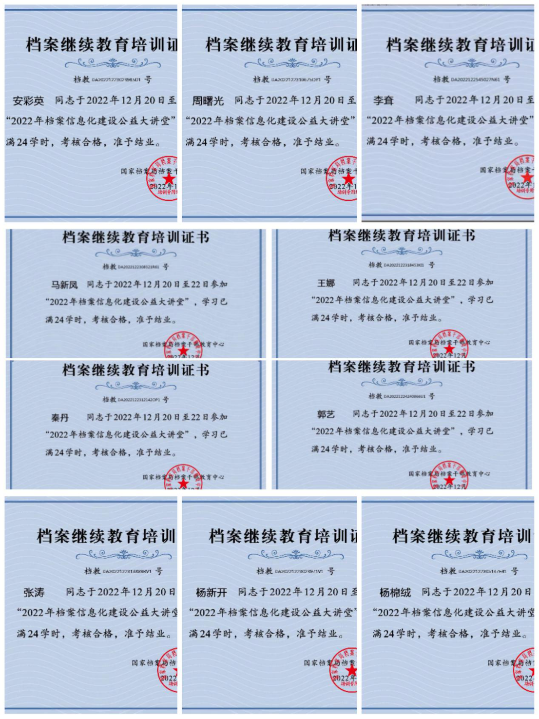 档案馆通过国家档案局了解到讲座培训信息后认为这是一次提升档案工作现代化水平,提高档案馆人员思想理论修养,加强档案工作素养的大好时机,立即发布通知组织动员全体人员在线学习,在工作群里转发了“档案信息化建设公益大讲堂学员手册”,指导大家了解学习内容,掌握在线注册,报名,收看讲座的方法,虽然当前疫情防控形势严峻,档案馆人员大多感染新冠病毒,处于居家隔离状态,但是大家克服身体上的不适,通过手机,电脑等积极参加在线学习培训,这次讲座规格高:由国家档案局副局长,中央档案馆副馆长付华作开班动员,邀请国家档案局领导,国家电子文件管理主管部门,国家档案局业务指导部门和地方档案部门以及高校从事档案信息化研究的专家学者担任主讲,讲座内容丰富,节奏紧凑:20日至22日,三天内每天上午九点到十一点半,下午两点到四点半,围绕“深入学习贯彻党的二十大精神,努力提高档案工作现代化水平”“数字时代背景下的国家电子文件管理发展战略”“电子档案长期保存的几个问题”“档案赋能数字政府与数字经济”“政务服务事项电子档案管理难点问题及应对之策”“新一代信息技术在档案工作中的应用”等六个方面专题对新时期档案工作进行了全方位的解读和宣讲,其中,对贯彻习近平总书记对档案工作重要批示的学习辅导,对二十大报告精神的重点解读,以及数字背景下档案工作,档案信息化工作的新探索,彰显了档案事业发展坚持党的领导,坚持人民立场,坚持依法治档,坚持改革创新,坚持安全底线的原则,经过两天时间的集中学习,大家吸收着档案前沿知识,感受着档案工作的荣光与责任,认真收看 蘑菇cctv资源,仔细聆听,用心体会,讲座之后积极参加在线考试,并且以优异的成绩全部通过了培训考试,取得了培训结业证书。