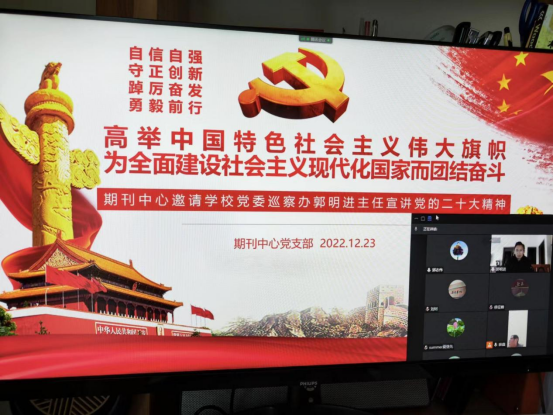 12月23日下午,应期刊中心邀请 蘑菇17视频,学校党的二十大精神宣讲团成员,党委巡察办郭明进主任以《认真学习党的二十大精神,自觉担负好立德树人根本任务》为题对党的二十大精神做了宣讲,期刊中心全体同志在线聆听了宣讲,会议由期刊中心党支部书记睢鑫同志主持。