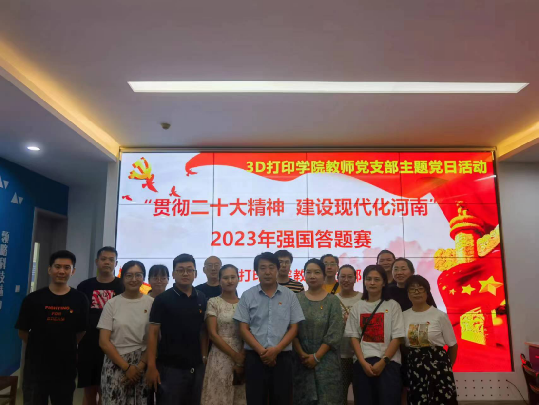 为深入推进学习贯彻党的二十大精神,扎实推进学习贯彻习近平新时代中国特色社会主义思想主题教育走深走实,8月9日,3D打印学院党委积极响应“学习强国”河南学习平台和校党委的号召 蘑菇17视频,引导学院教师党支部组织开展了以“贯彻二十大精神 建设现代化河南”2023年强国答题赛为主题的主题党日活动,教师党支部全体教工党员参加了比赛。