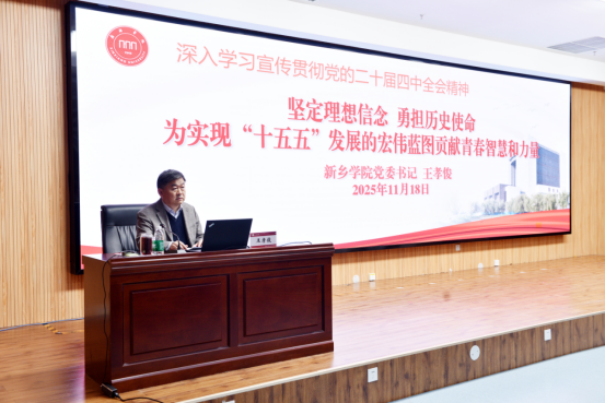 王孝俊以《坚定理想信念 勇担历史使命 为实现“十五五”发展的宏伟蓝图贡献青春智慧和力量》为题,从党的二十届四中全会的重要地位和深远意义,“十五五”规划的重要原则和战略部署以及在推进中国式现代化进程中青年的责任担当三个方面,紧密结合学校实际 17蘑菇视频,学生实际,对全会精神进行了全面系统的宣讲和深入浅出的阐释。